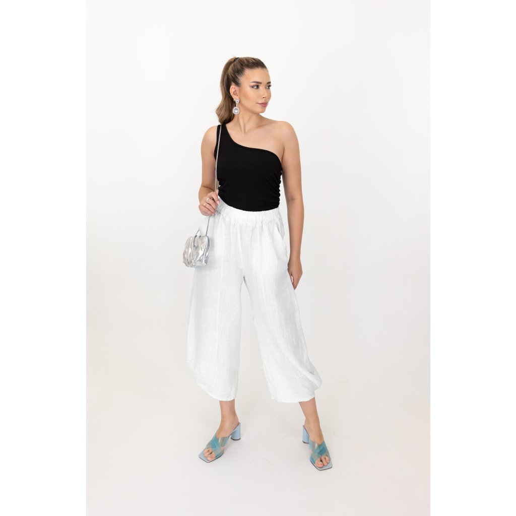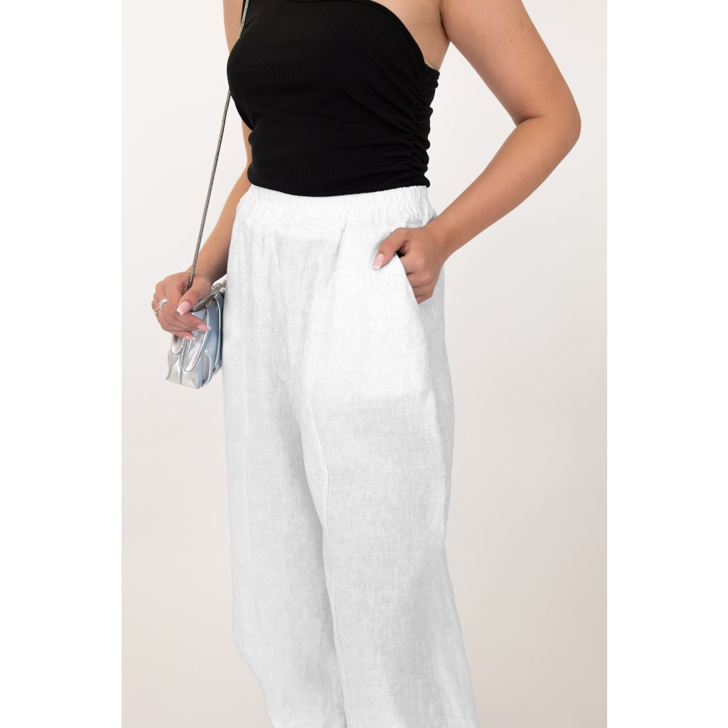 Lněné kalhoty Aelia v pastelově modré barvě spojují lehkost, eleganci a středomořský šarm. Jsou ušity z jemného 100% lnu s nižší gramáží, který je ideální pro horké letní dny. Kalhoty mají volný střih s mírně zaoblenými nohavicemi, elastický pas pro pohodlí a dvě praktické kapsy po stranách.