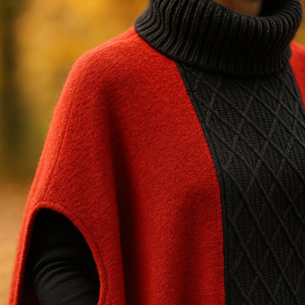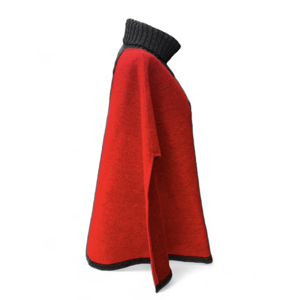 Působivý kousek, který nevyžaduje složité kombinace – červené pončo Julia nejlépe vynikne s černými úzkými kalhotami, legínami nebo sukní. Ideální přes hladký rolák, pletené šaty nebo jednoduchý svetr. Přidejte kožené boty, šálu v tónu a máte outfit připravený na procházku městem i zimní výlet.