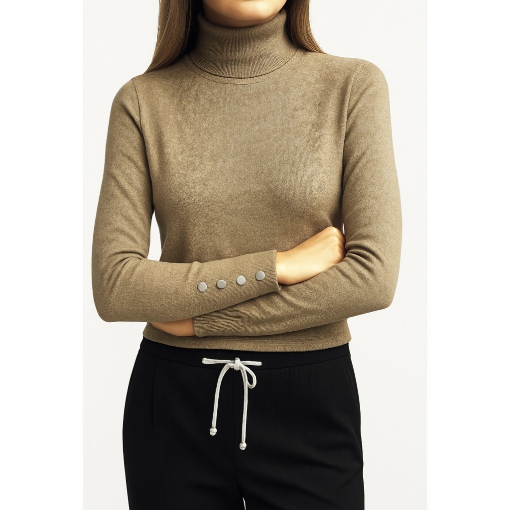 Elegantní jemně pletený rolák, který kombinuje pohodlí, měkkost a nadčasový styl. Má přiléhavý, ale pohodlný střih, dlouhé rukávy zakončené manžetou se stylovým detailem knoflíků. Díky měkkému materiálu s příměsí vlny a kašmíru je příjemný na těle a vhodný pro celodenní nošení. Skvělý základ šatníku, který snadno zkombinujete do elegantních i ležérních outfitů.