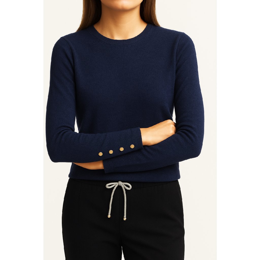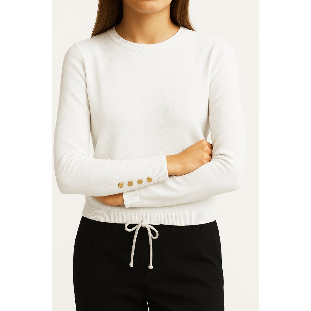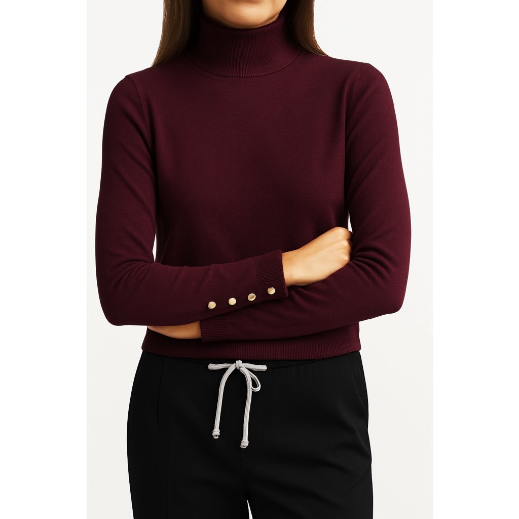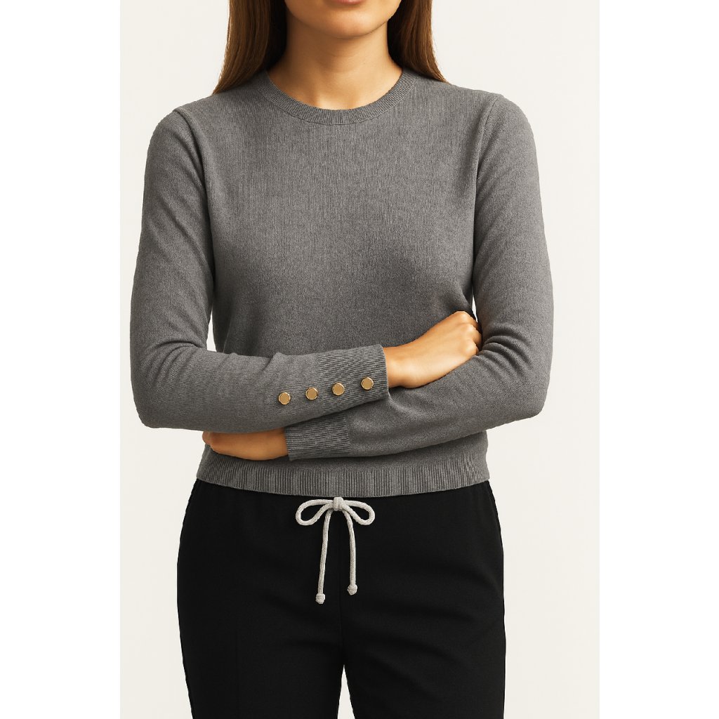 Na rukávech je svetr ozvláštněn drobným lemem se třemi dekorativními kovovými cvočky, které dodávají modelu jemný, ale výrazný akcent. Spodní lem i manžety jsou zakončeny pružným žebrováním, díky čemuž svetr krásně drží tvar a působí elegantně i při delším nošení.