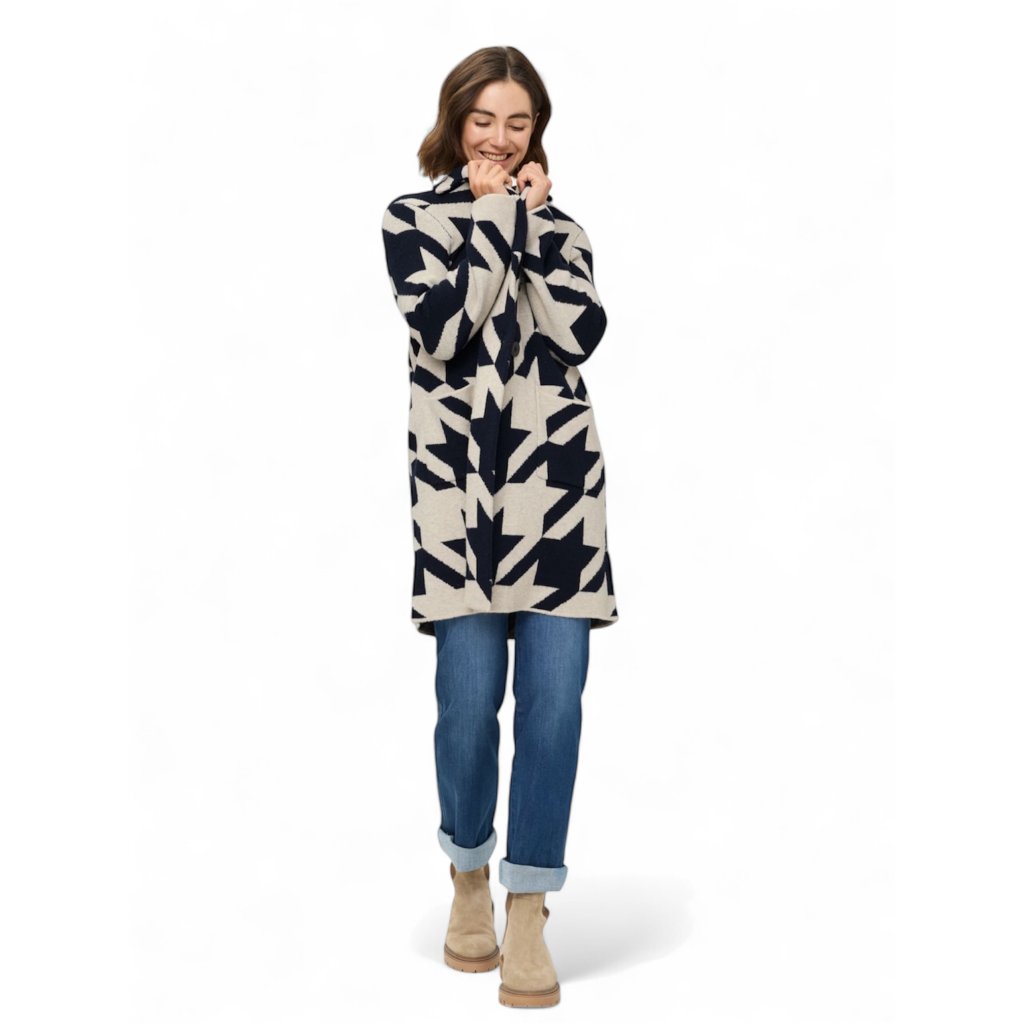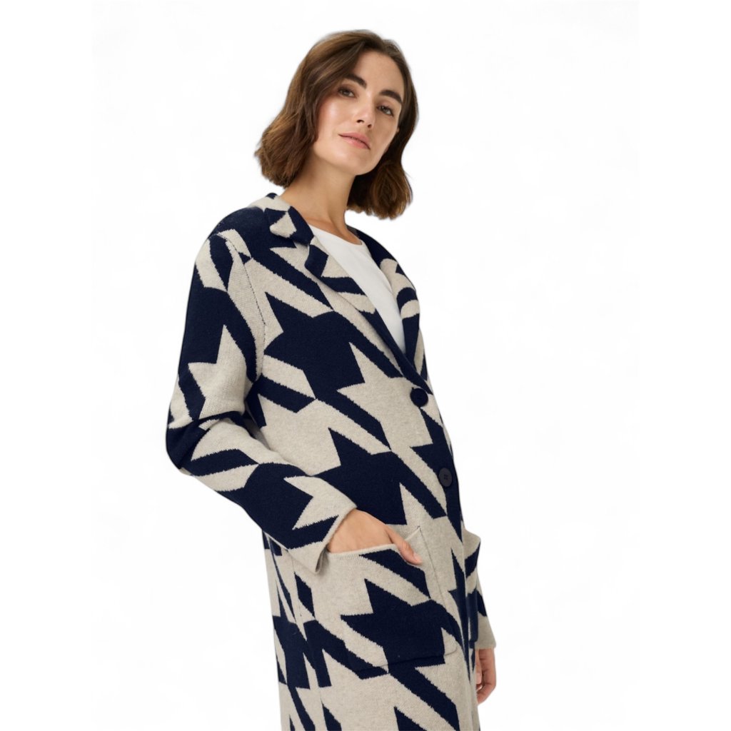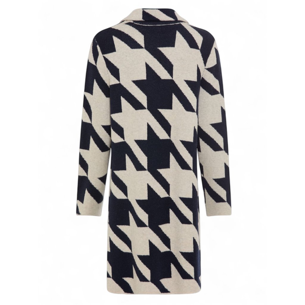 Dlouhý kardigan s výrazním, klasickým vzorem kohoutí stopy s límcem, dlouhými rukávy a praktickými kapsami byl navržen tak, aby poskytoval maximální pohodlí a volnost pohybu. Model se zapíná na dva knoflíky, což umožňuje vytvářet různé styly podle příležitosti či počasí.