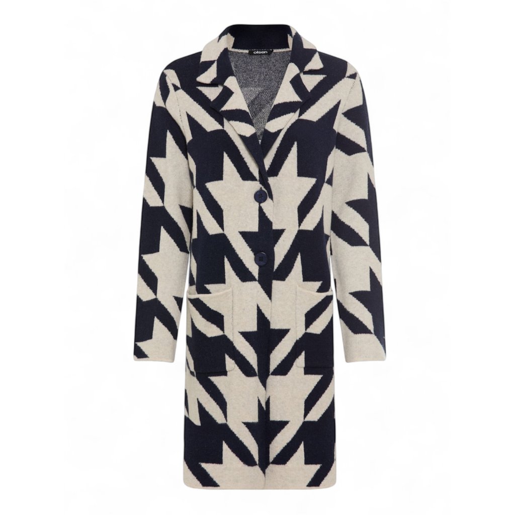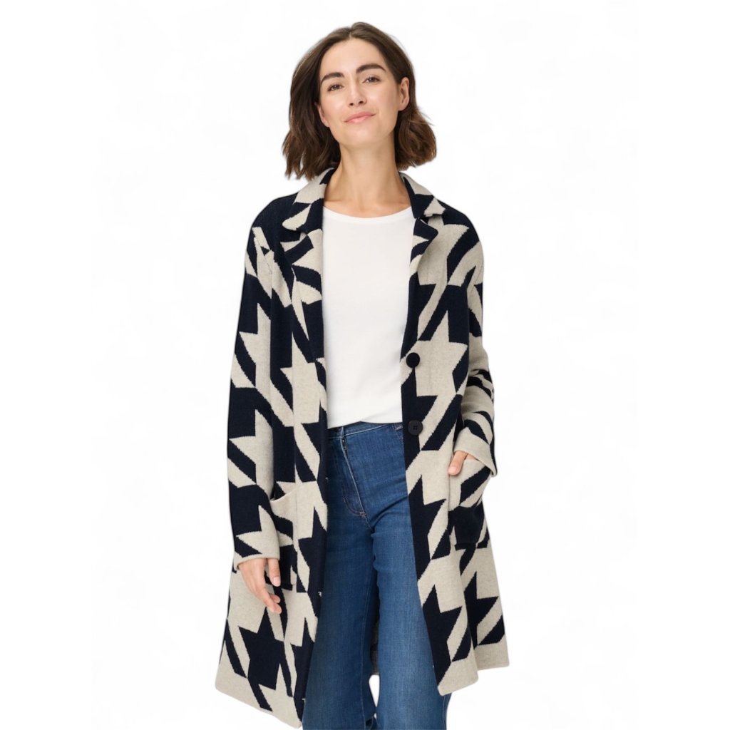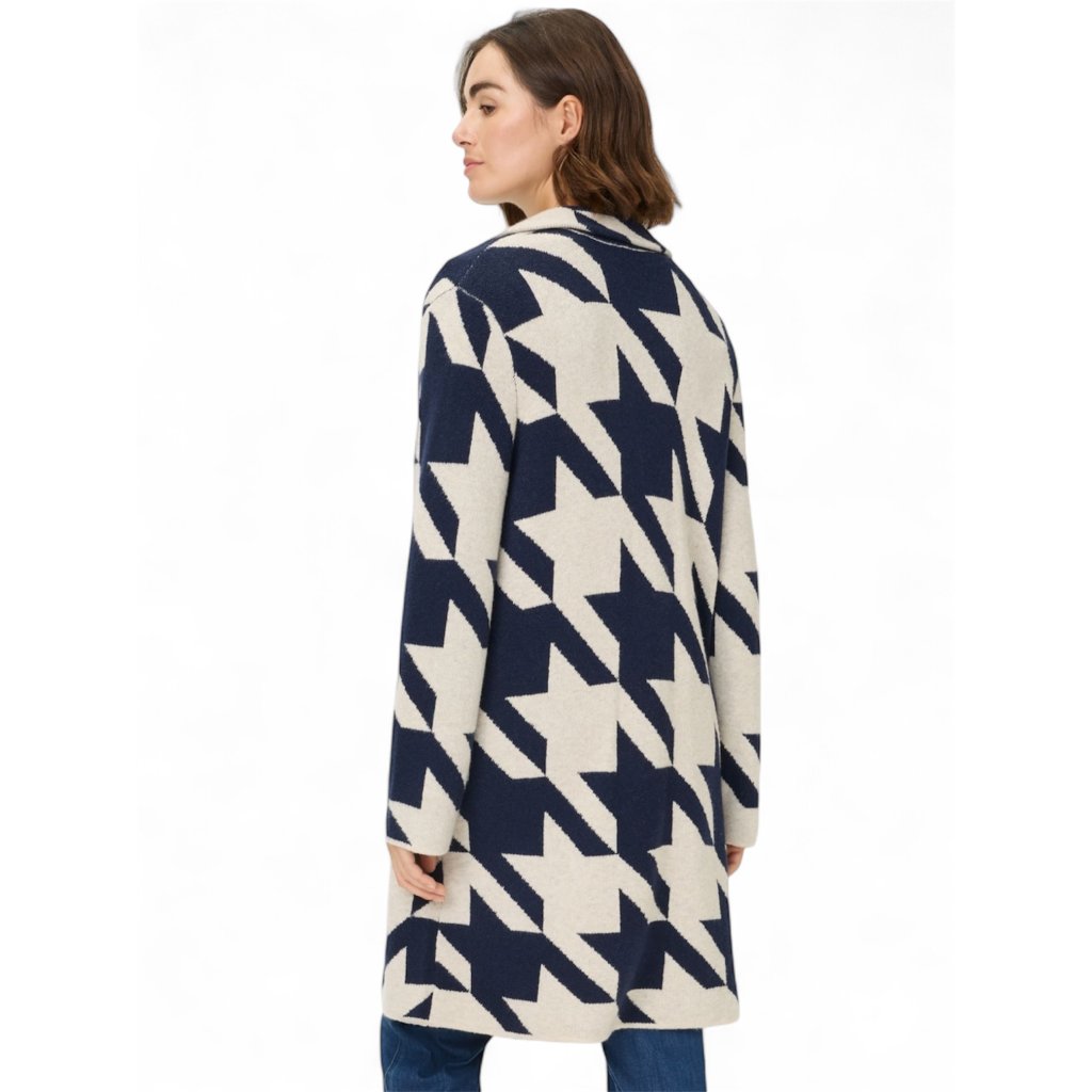 Dlouhý kardigan s výrazním, klasickým vzorem kohoutí stopy s límcem, dlouhými rukávy a praktickými kapsami byl navržen tak, aby poskytoval maximální pohodlí a volnost pohybu. Model se zapíná na dva knoflíky, což umožňuje vytvářet různé styly podle příležitosti či počasí.