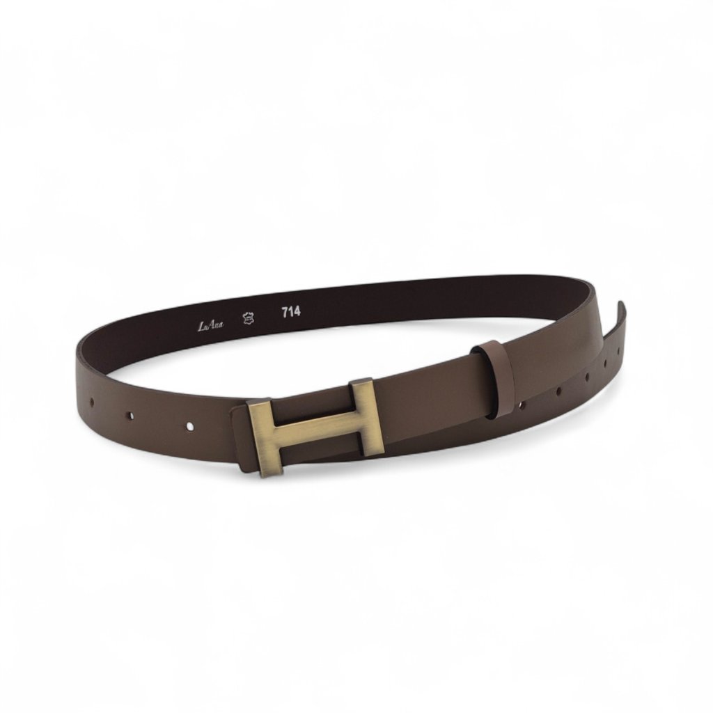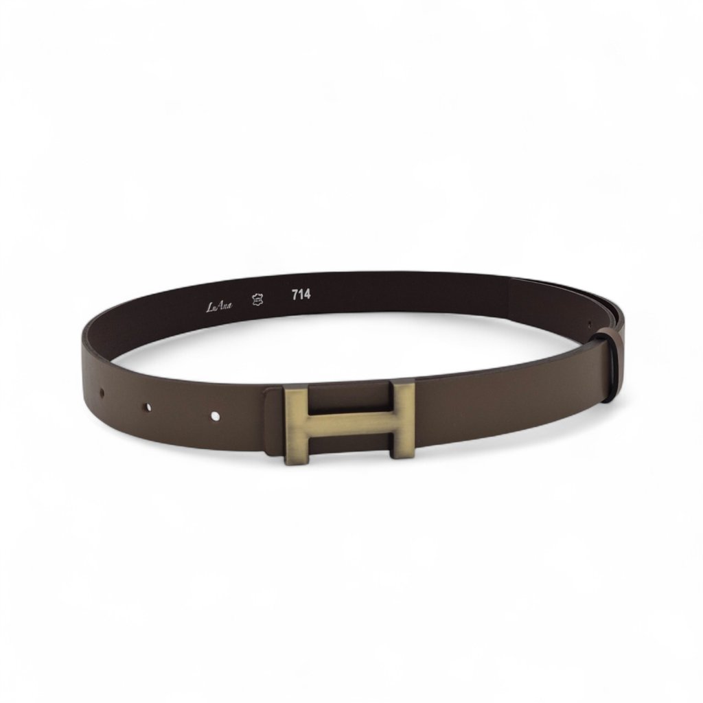 Dámský pásek Elen v jemné hnědé barvě je nadčasovým doplňkem, který decentně zvýrazní váš outfit. Je vyrobený z pravé hladké kůže s matným povrchem a doplněný o mosaznou sponu ve tvaru písmene H – funkční a zároveň elegantní detail.