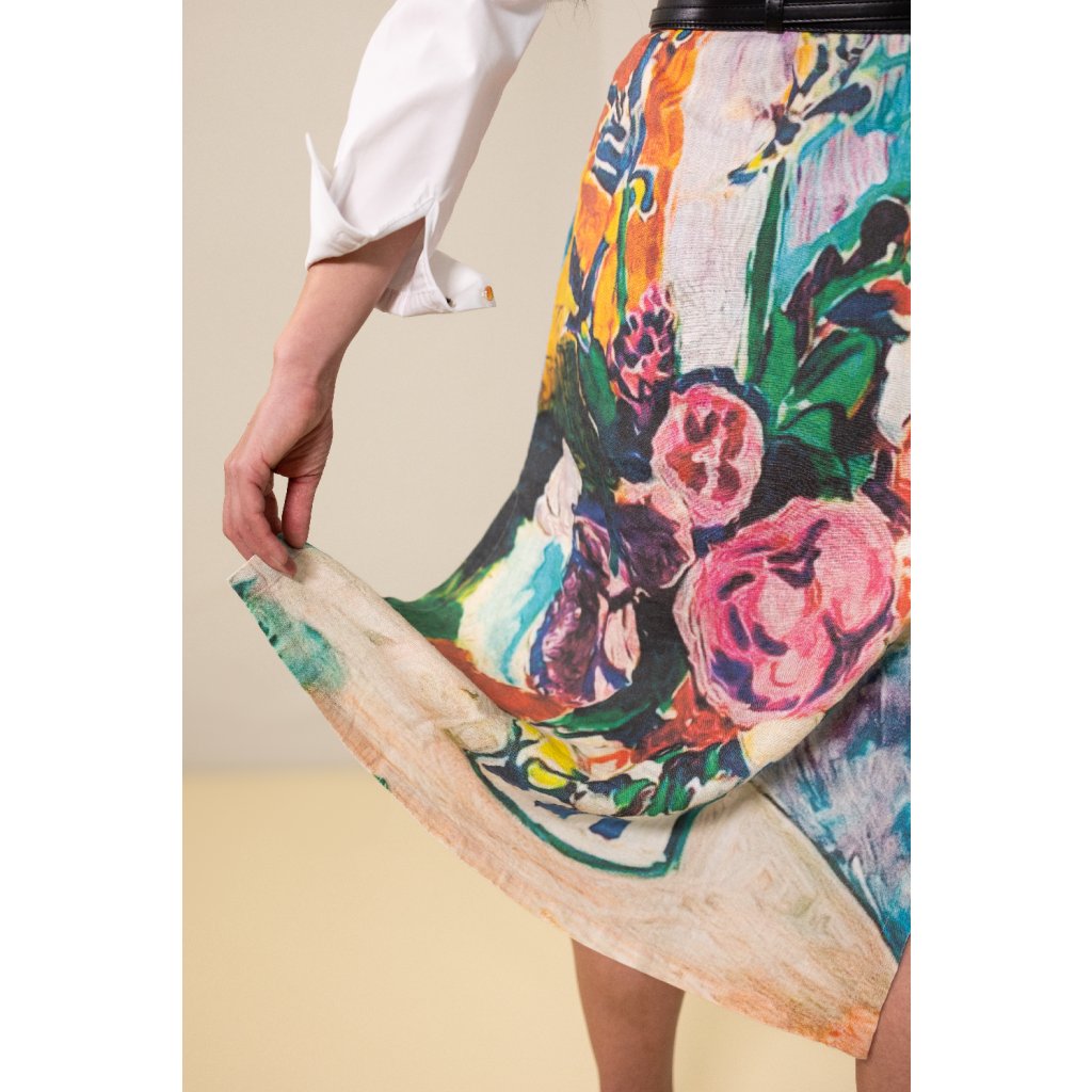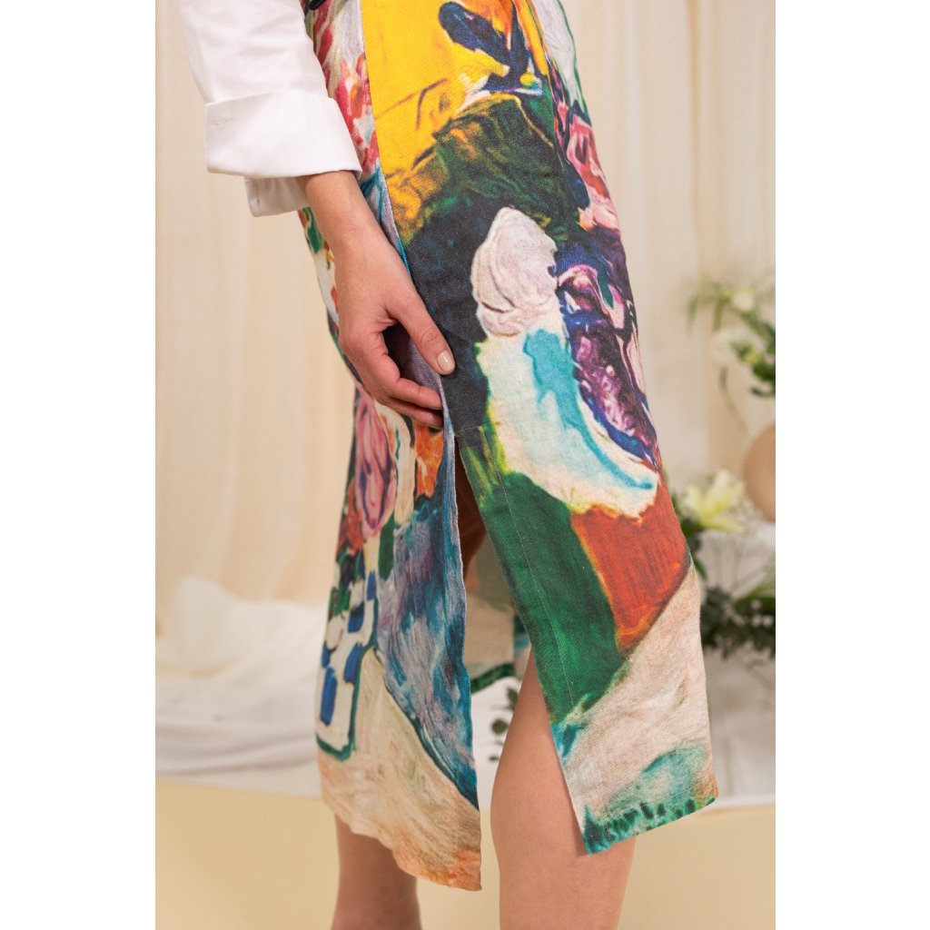 Barva a vzor: Zelená barva s jemným vzorem inspirovaným obrazem Pivoňky od Henri Matisse dodává šatům jedinečný umělecký nádech.