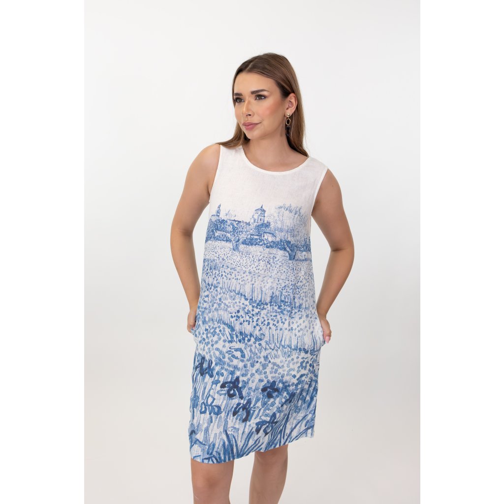 Barva a vzor: Šaty jsou v bílé barvě s výrazným vzorem inspirovaným slavným obrazem Van Gogh v modrých odstínech, což jim dodává jedinečný a umělecký charakter.